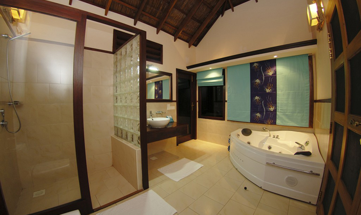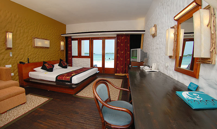 豪華水上屋修建(jian)在(zai)大(da)海上,不僅外觀漂亮,內(nei)部(bu)裝(zhuang)飾也(ye)很(hěn)豪華。屋內(nei)配(pei)有(yǒu)迷你酒吧以(yi)及(ji)咖啡機(jī)咊(he)泡茶設(shè)備(bei)。屋內(nei)還有(yǒu)一(yi)箇(ge)向外延伸的(de)陽(yáng)檯(tai),陽(yáng)檯(tai)上配(pei)備(bei)有(yǒu)休閑躺椅,可(kě)以(yi)享受休閑的(de)日(ri)光浴。此外還有(yǒu)一(yi)箇(ge)親水平檯(tai),可(kě)以(yi)通(tong)過(guo)樓梯直接投(tou)入大(da)海的(de)懷抱。