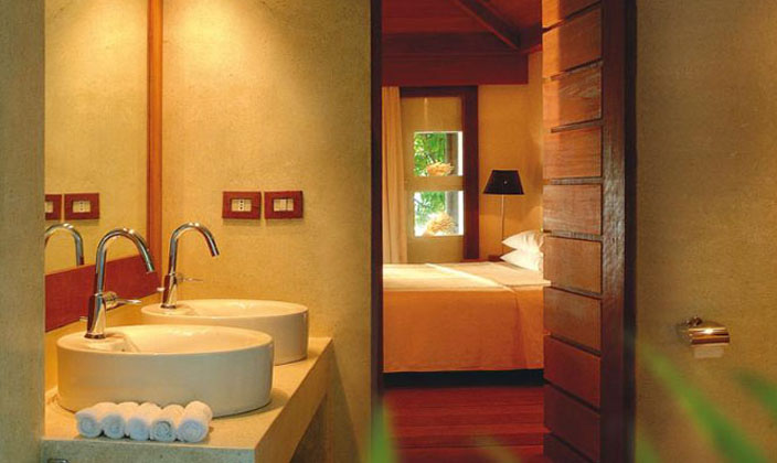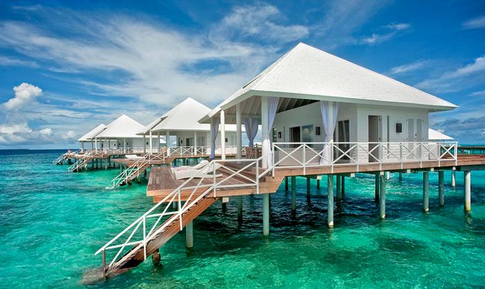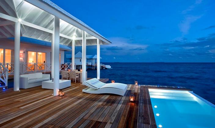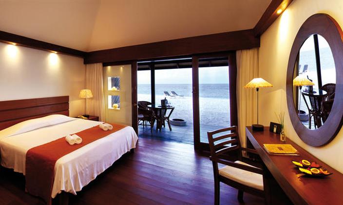 水上别墅全都擁有(yǒu)私人(ren)露檯(tai),可(kě)直接通(tong)向水中(zhong)。别墅中(zhong)精(jīng)緻的(de)傢(jia)具(ju)擺設(shè)布滿整箇(ge)空間,包括藤製(zhi)傢(jia)具(ju),意大(da)利當代(dai)燈飾咊(he)手工(gong)鑲的(de)木(mù)質(zhi)樓梯,使客人(ren)在(zai)假期中(zhong)實現(xian)夢幻度假的(de)感受。